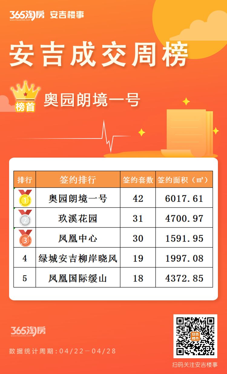 成交榜排行前五的分别是:奥园朗境一号、玖溪花园、凤凰中心、绿城安吉柳岸晓风、凤凰国际缓山。